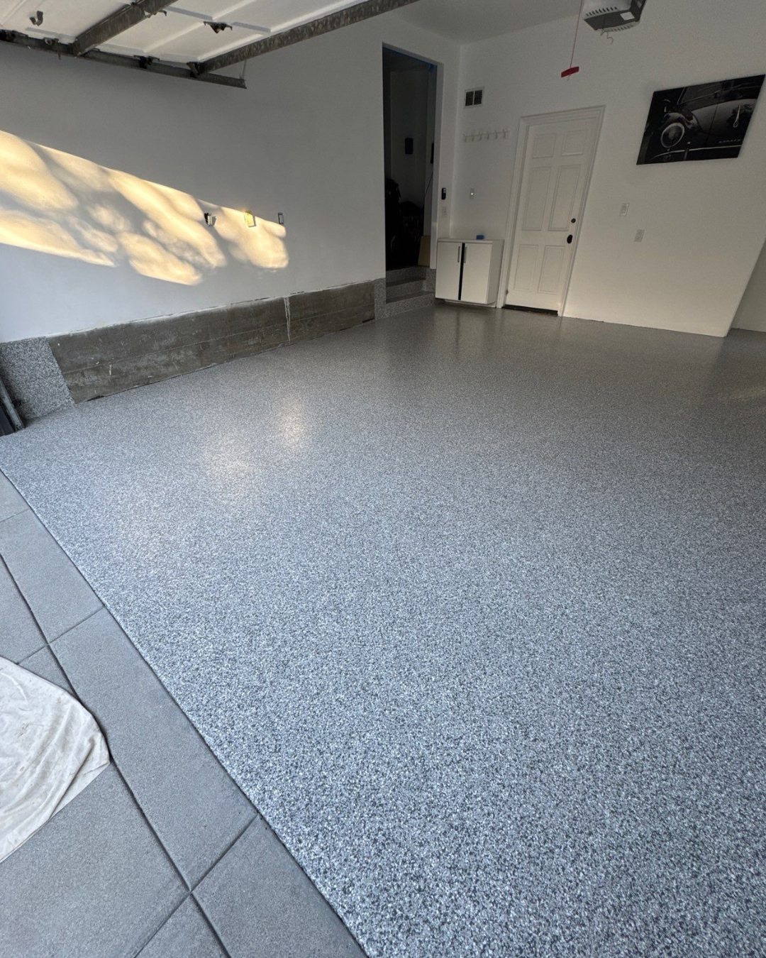 This Long Beach project features a full flake garage flooring system, delivering a seamless, textured surface designed for both durability and visual appeal. Grey flake garage floor coatings remain one of the most popular options for homeowners due to their clean, modern look and ability to conceal imperfections.