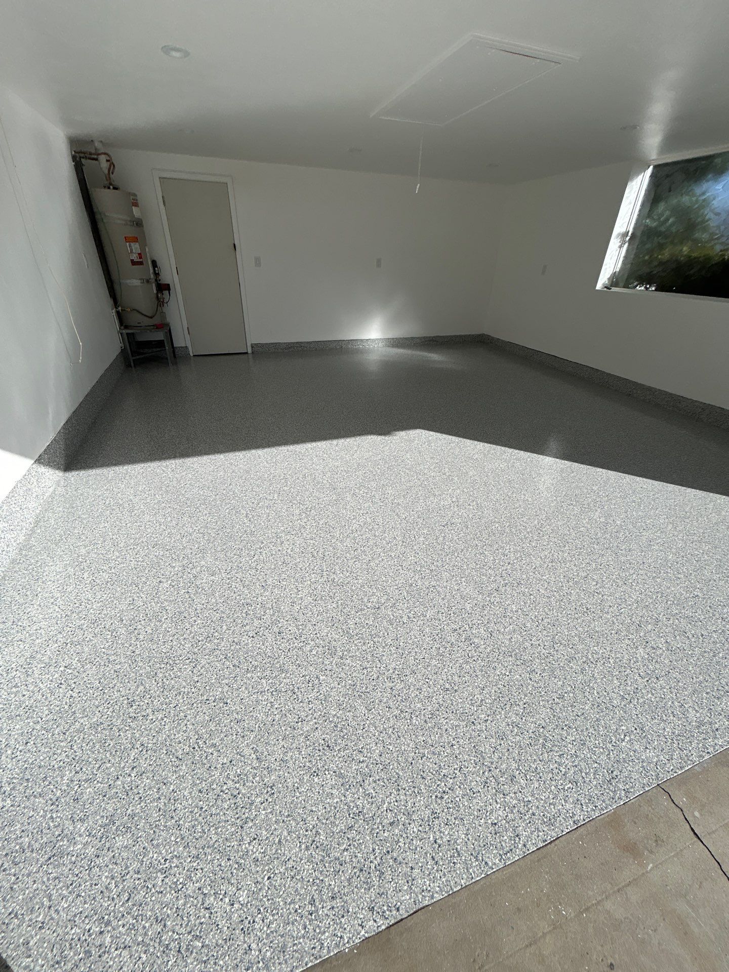 The Tidal Wave finish has become one of the most requested options for homeowners across Southern California. Its modern grey and blue tones create a clean, timeless look while helping to conceal everyday wear from vehicles, foot traffic, and daily use. The natural variation in the flake blend adds depth and texture, making dust, dirt, and minor marks far less noticeable compared to bare concrete or traditional epoxy floors.